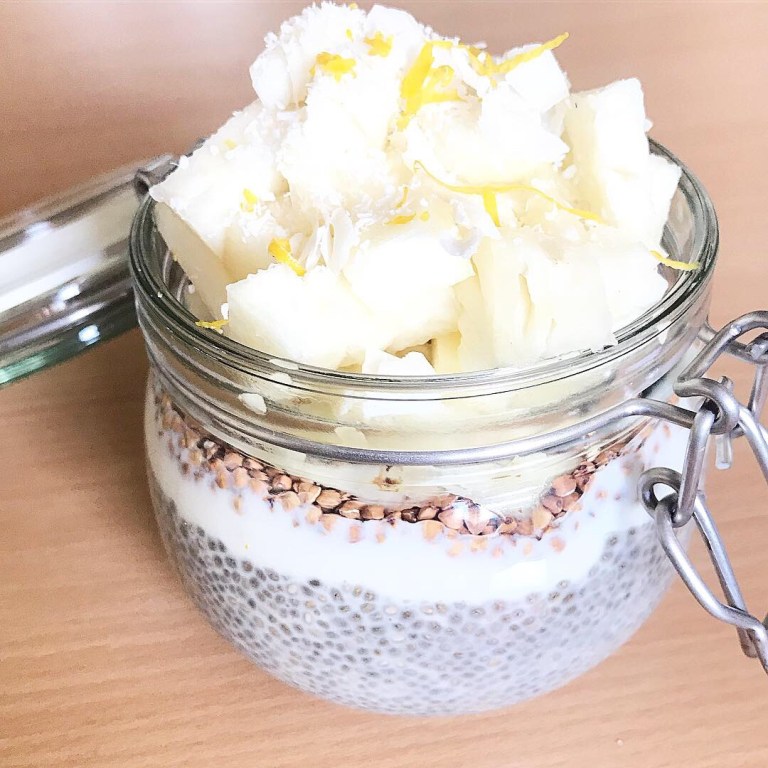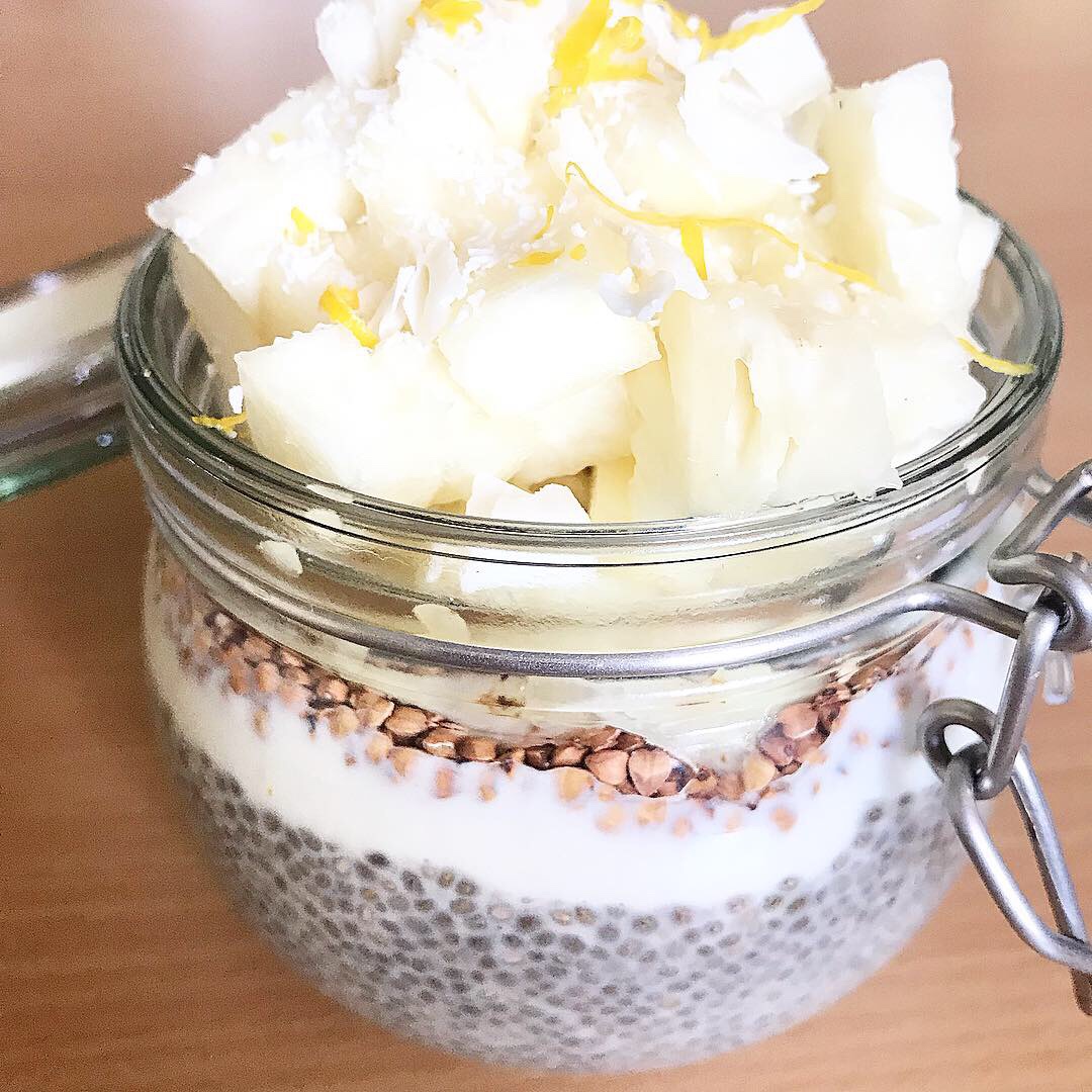 Le lendemain matin, rajoutez les topping dans l’ordre (yaourt, Kasha, Ananas, zeste, et coco râpée)
