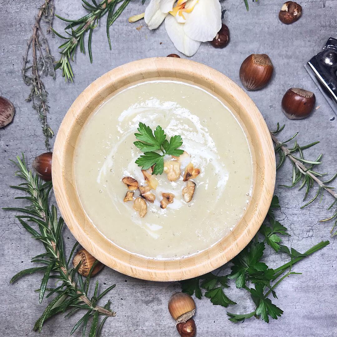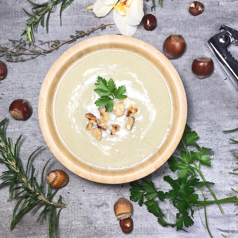 Répartir le velouté dans les assiettes creusent en rajoutant en topping quelques noix et/ou noisettes torréfiés (ou non)