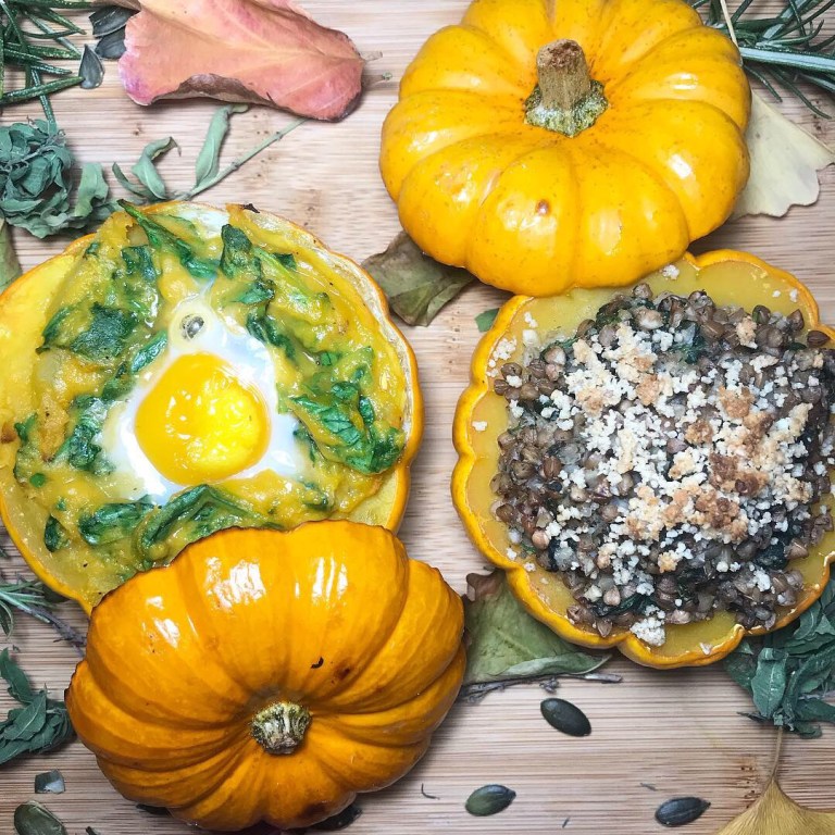 Sortir la mini courge du four et la garnir avec le Kasha aux épinards.