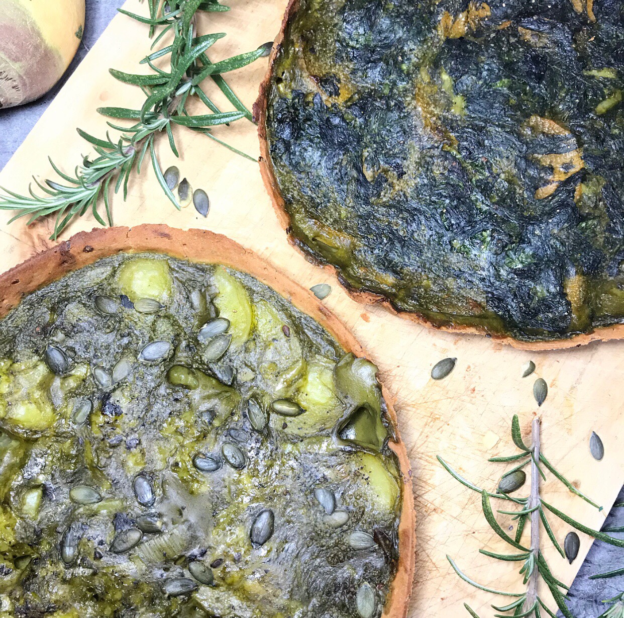 Disposez ensuite les rondelles de Pomme de terre, de Rutabaga et les épinards sur la pâte brisée(si vous avez séparé votre pâte dans deux moules, répartissez les rondelles de légumes comme souhaité … ici rutabaga et épinards d’un coté et tout pomme de terre de l’autre mais vous pouvez mélanger)