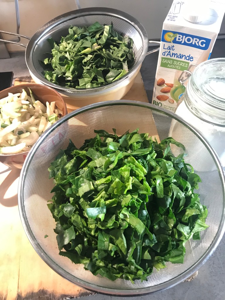 Faites blanchir dans de l’eau bouillante légèrement citronnée les feuilles de blettes pendant 5 et les côtes pendant 10 minutes. (Séparément !) Puis Egouttez les (toujours séparément).